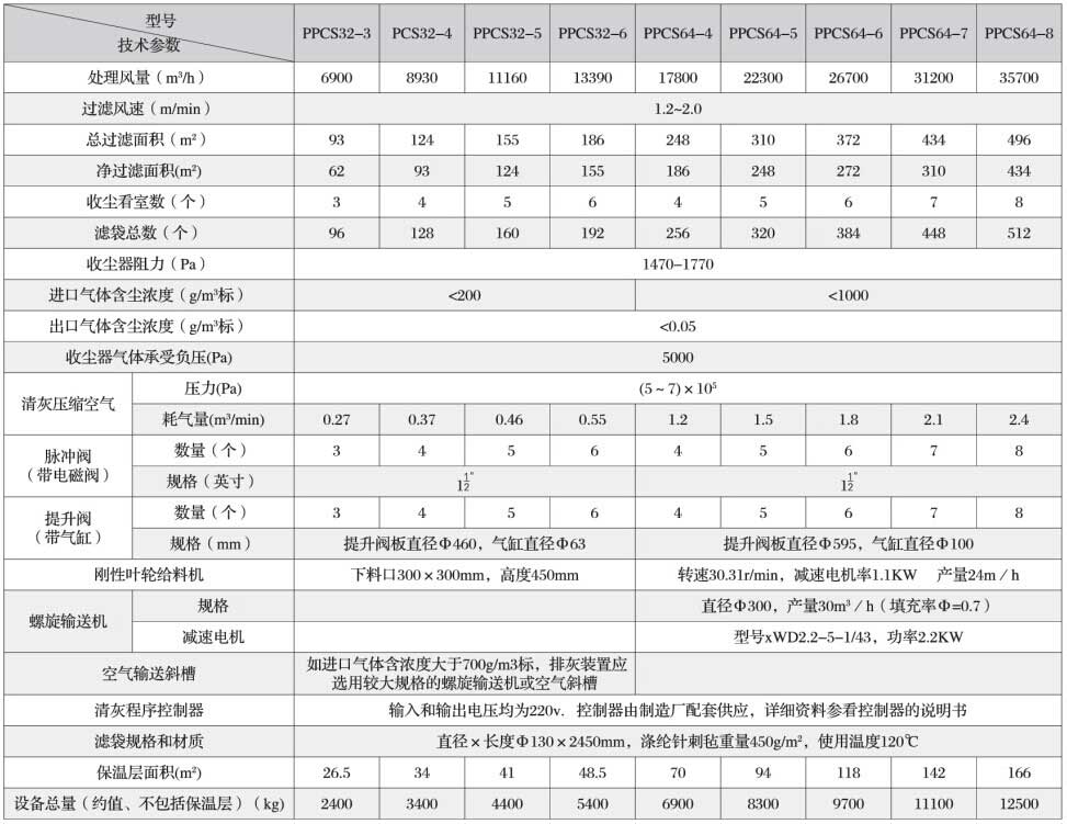 PPCS32、PPCS64型氣箱式脈沖袋收塵器技術(shù)性能表